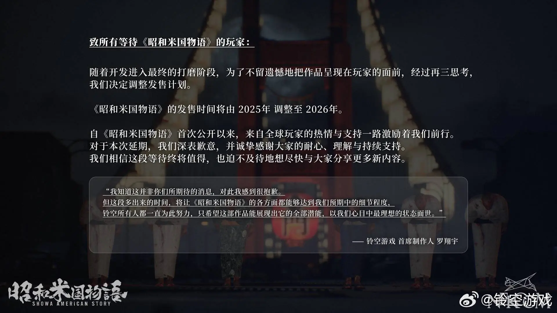 IT之家 11 月 12 日音书,国产游戏设备商铃空游戏当天晓示,跟着设备插足最终的打磨阶段,为了不留缺憾地把作品呈当前玩家的眼前,历程再三想考,决定编落发售贪图。《昭和米国物语》的发售手艺将由 2025 年编削至 2026 年。